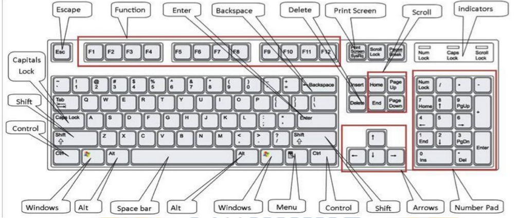 A standard English keyboard typically consists of alphanumeric keys, punctuation keys, function keys, navigation keys, and modifier keys. Alphanumeric keys include letters (A-Z) and numbers (0-9), arranged in a QWERTY layout.